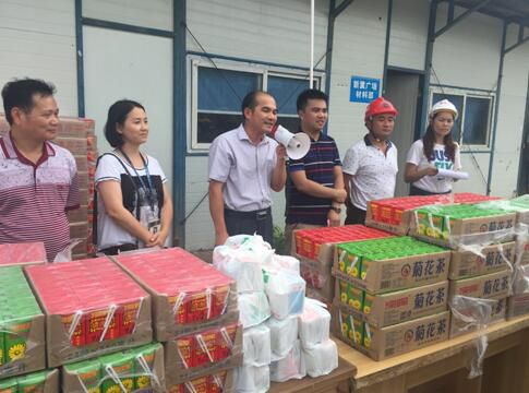 下午15點(diǎn)40分,送清涼活動(dòng)在新翼廣場(chǎng)項(xiàng)目有條不紊的組織下正式拉開序幕。香甜可口的西瓜、功效齊全的防暑藥品、清熱解毒的涼茶堆滿整個(gè)派送臺(tái)。工友們整齊排列隊(duì)伍,一一從派送員手中接過慰問品,臉上堆滿的笑容?!案兄x北滘鎮(zhèn)總工會(huì)、公司工會(huì)此次送清涼活動(dòng)。我們感覺很窩心也很開心”領(lǐng)到慰問品的工友們開心的告訴記者。