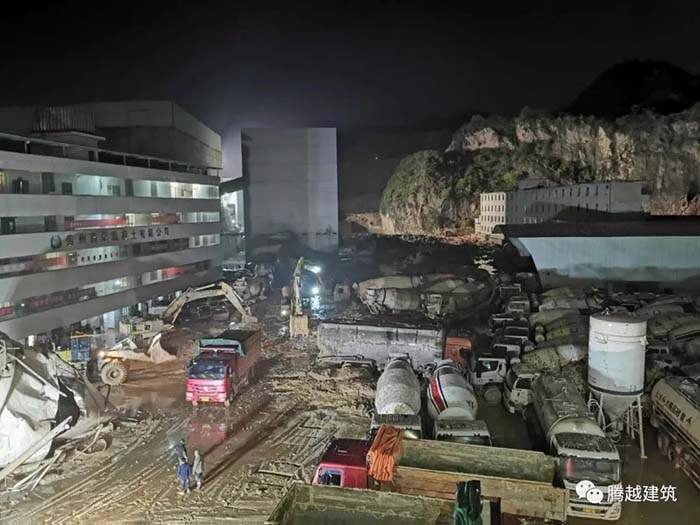 時間一分一秒過去,且雨勢不斷變大,搶險現(xiàn)場淤泥不斷累積,但依舊還有7名失聯(lián)人員未找到。了解到現(xiàn)場緊急情況后,貴州西南上城天悅府項目黨支部隨即增派人員,組成現(xiàn)場救援先鋒隊,通過交替使用鏟車、挖掘機等設備及時清理現(xiàn)場淤泥、破除倒塌的混凝土建筑廢墟,協(xié)助消防人員抽排現(xiàn)場低洼處積水,高效有序開展各項搶險工序,確保最快速度打開現(xiàn)場救援通道。