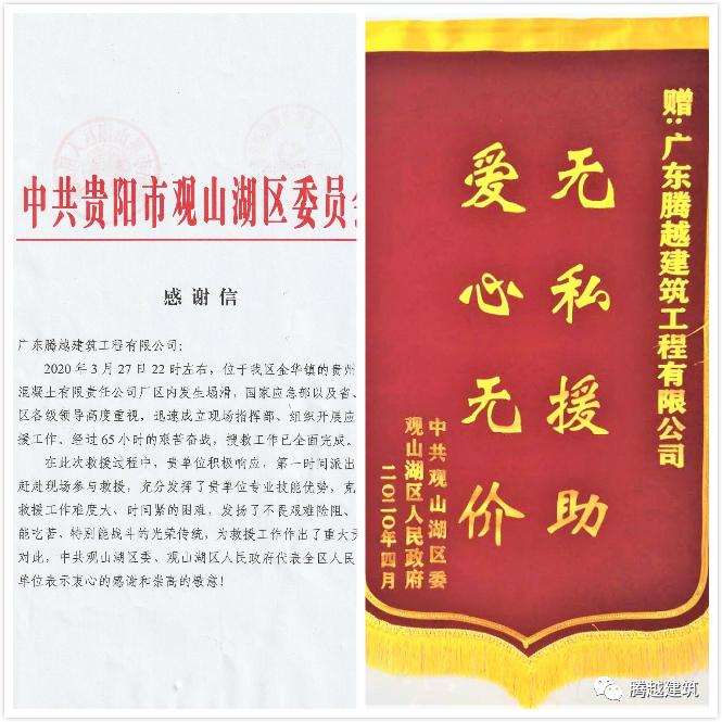 2020年5月12日下午3時,在貴陽市觀山湖區(qū)“關于327廠區(qū)坍塌事件”救援表彰大會上,騰越建筑貴州西南上城天悅府項目親手接過了由中共觀山湖區(qū)委、觀山湖區(qū)人民政府頒發(fā)的救援感謝信及表彰錦旗,騰越建筑勇?lián)熑?,踐行使命的事跡被當?shù)孛襟w爭相報道。